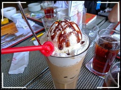 冰開始融化了啦@@"上面的鬆餅挖些冰淇淋跟鮮奶油一起吃下,就因為感覺不會太甜而且冰冰的,